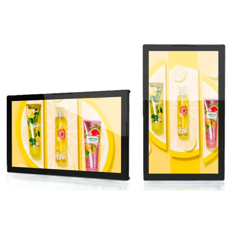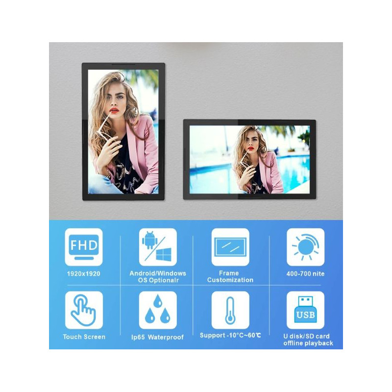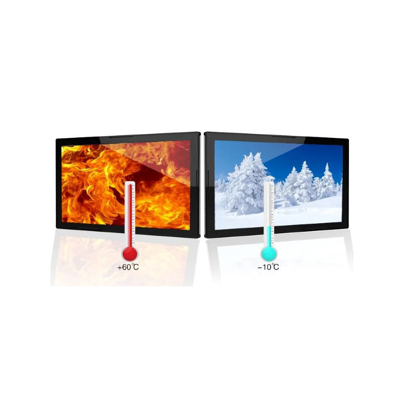 The monitors feature an open-mold aluminum alloy frame paired with high-quality tempered glass, creating a sleek, modern design with edge-to-edge flat glass. The IP65-rated front panels provide water- and dust-proof protection, making these monitors ideal for commercial, industrial, and organizational applications.