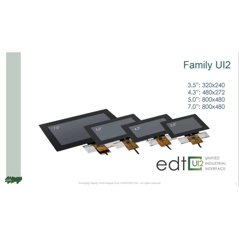 The uniform interface for both display and touch mean that the 3.5 inch display can be exchanged for the 4.3, 5.0 and 7.0 inch displays without changing the hardware. Based on this hardware platform, the EDT UI2 range offer’s a low-end to high-end version of the same product without changing the electronic interface.